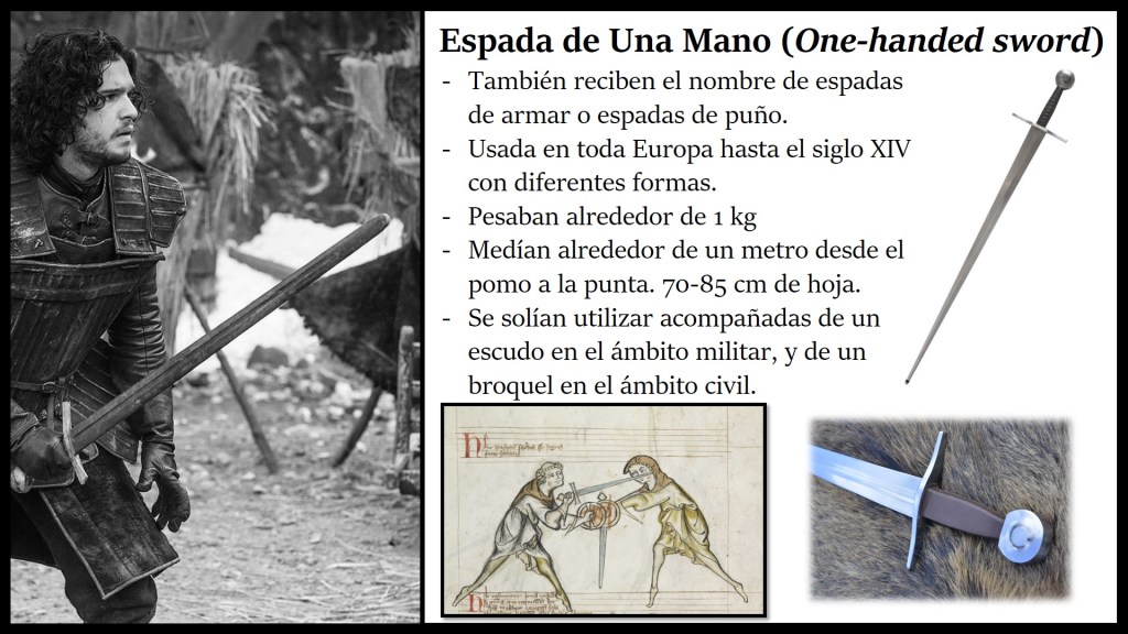 Si lo que queremos es deducirlo por las armas que aparecen en la serie, podemos encontrarnos con algún problema. Si bien es cierto que la mayor parte de espadas que nos encontraremos son espadas largas, el tipo de espada que se utilizó en los siglos XIV y XV en toda Europa; también aparecen la espada de armar o espada de una mano, que es inmediatamente anterior a la espada larga, acompañada del escudo; y otras como pueden ser la espada de Arya, un espadín, un arma que no se utilizaría hasta el siglo XVII; o espadones (espadas de dos manos) como Hielo de Eddard Stark.