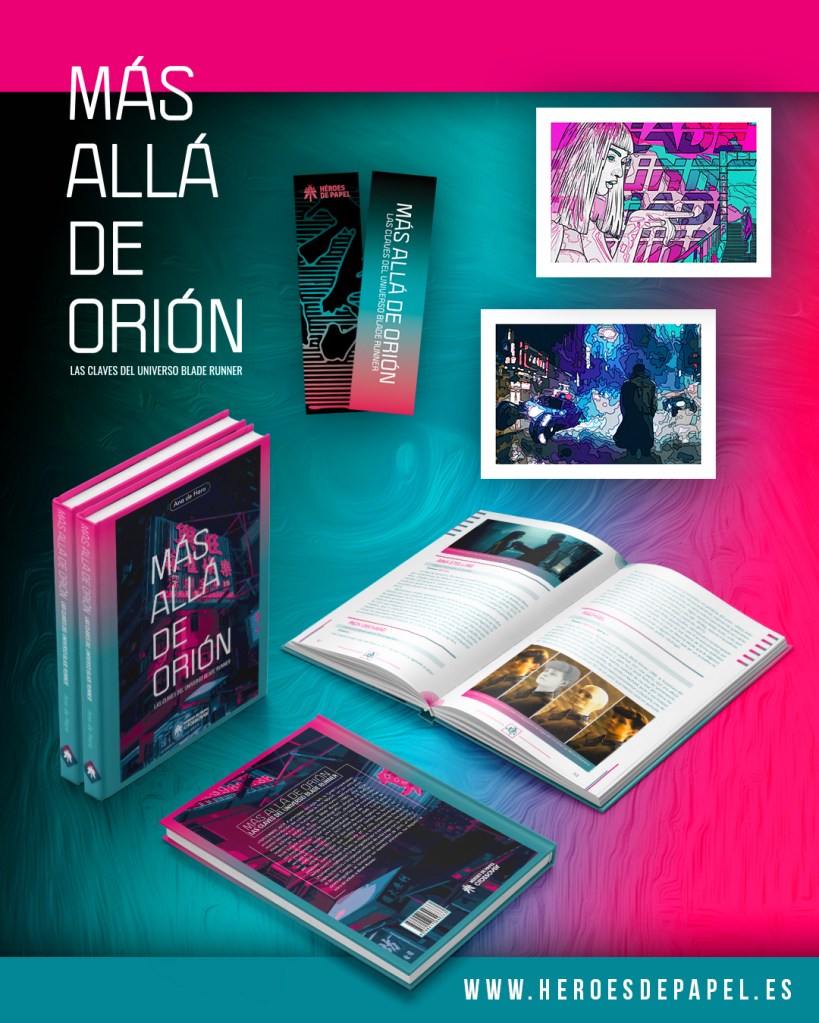 Por imitar la forma común de aproximarse a Blade Runner de aquellos que llegan nuevos al universo fílmico ideado por Ridley Scott partiendo de la base creada por Philip K. Dick en “¿Sueñan los androides con ovejas eléctricas?” (y que Scott nunca leyó, como se explica en el libro de Héroes de Papel), es decir, de la estética al contenido. Lo primero que solía llamar la atención a aquellos que contemplaban el universo de Blade Runner por primera vez (ya en su estreno incluso) era su potente estética, definitoria de prácticamente la mayoría de las representaciones posteriores del cyberpunk y la ciencia ficción, y su puesta en escena a través de una fotografía y diseño de producción apabullantes, e igualmente entrará por los ojos el maquetado, portada y contraportada de “Más allá de Orión. Las claves del universo Blade Runner” (algo habitual en todas las publicaciones de Héroes de Papel), jugando con los tonos rosados y azules propios de la estética de neón que instauró Blade Runner y que se intercalan incluso dentro del libro para señalar determinados párrafos, y con los elementos nipones —como la geisha en el anuncio gigante en la película, los paneles leds de grandes corporaciones como Atari o el kanji luminoso junto al que se sienta Deckard y que se utiliza en la edición del libro como elemento decorativo en la parte baja de cada página—.