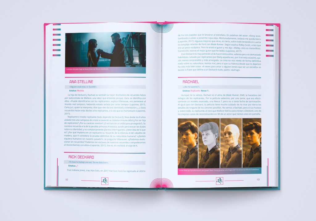 Once capítulos que sirven no sólo para copar el libro de contenido —tanto propio como ajeno, en tanto que menciona y cita otras muchas fuentes a las que recurrir en caso de querer sumergirnos del todo en la/s obra/s (véase por ejemplo que la autora señala cómo acceder a determinadas escenas descartadas durante el montaje de la película original)— sino para estructurarlo y organizarlo de una manera atractiva y sencilla de seguir, separando desde aspectos como el diseño sonoro y la música, problemas durante la producción, la figura de Philip K. Dick o el análisis de la más reciente “Blade Runner 2049” de otros aspectos que tienen que ver con la simbología, la influencia de Blade Runner en la cultura pop o un análisis pormenorizado de sus personajes.