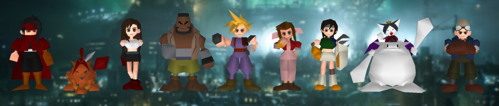 El plantel de héroes de “Final Fantasy VII” está compuesto principalmente por nueve personajes: Cloud Strife, Aeris Gainsborough (en español sólo Aeris), Tifa Lockhart, Barret Wallace, Red XIII (o Nanaki, según se prefiera), Cait Sith, Cid Highwind, Yuffie Kisaragi y Vincent Valentine, pudiendo establecer una primera separación obvia por las diferencias en sus diseños. Red XIII y Cait Sith, que al ser una especie de gran felino y un gato robot montado sobre un moguri gigante poseen diseños fácilmente reconocibles, sin la posibilidad de ser confundidos en su idea original con el resto de humanos. Lo mismo ocurre con otros personajes aspecto humanoide como Jénova o las criaturas conocidas como ARMA.