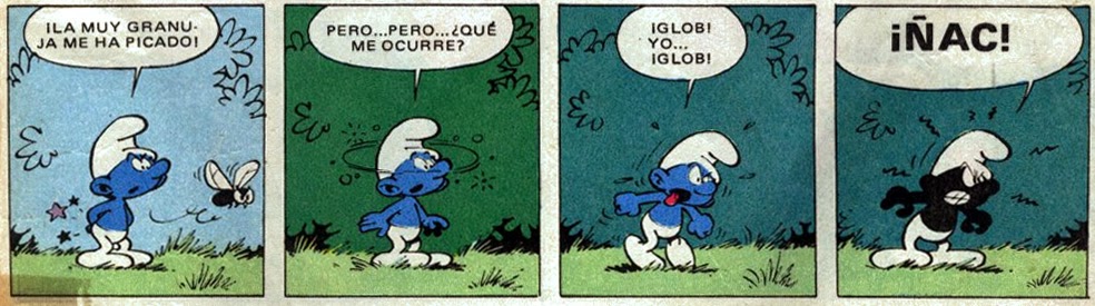 Aunque es comúnmente aceptado que el zombie moderno es creado por George A. Romero, unos años antes a la obra del cineasta se publicaba Los pitufos negros (Peyo – 1963) donde estaban presentes estos nuevos elementos del zombie moderno: la mosca “Bzz” pica en la cola a un pitufo volviéndolo salvaje y tiñendo su piel de negro, reduciendo su vocabulario a la palabra “Gnap!” y su comportamiento a tratar de morder al resto de pitufos, los cuáles se vuelven también pitufos negros al ser mordidos.