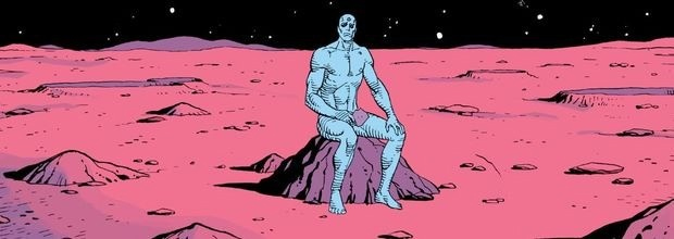 Superman es un extraterrestre que llega a la Tierra y acaba siendo más humano que los humanos —entendiendo “humano” en su acepción de benévolo o compasivo—, en Watchmen (Alan Moore y Dave Gibbons – 1986) encontramos la idea contraria en el personaje del Dr. Manhattan, un humano que acaba completamente al margen de la humanidad. Quizás como revisión del mito de Superman es menos obvia en tanto que su aspecto es menos humano y prescinde de toda la parafernalia que tiene que ver con la capa, el traje de superhéroe, etc… pero la idea tras él es aún más acentuada que con Superman: el poder de un Dios, aquí literal pues Manhattan es capaz de manipular la materia a niveles subatómicos, es clarividente y su existencia está más allá del tiempo y el espacio. Su condición de Dios provoca que este “Superman” se despegue cada vez más de los problemas humanos, de los humanos en sí y de su propia condición de humano. El Doctor Manhattan entonces es Superman sin su humanidad o Superman destruido por la falta de humanidad.