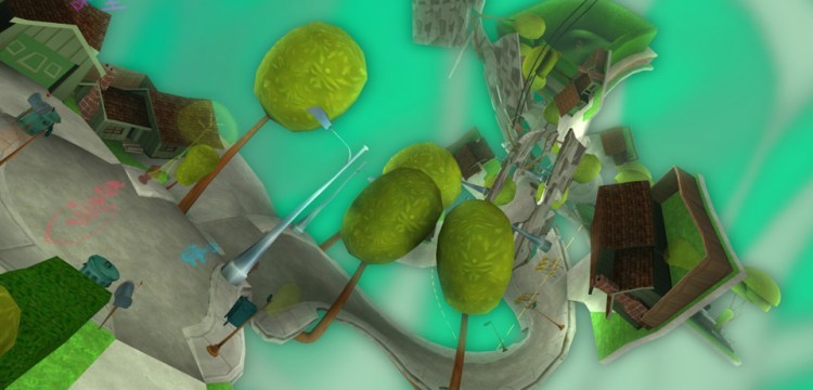 La construcción que hace Psychonauts de este nivel abraza la estética de lo extraño, la irrupción de lo raro dentro de lo normal: lo que en apariencia es el típico barrio residencial estadounidense se convierte, dentro de la paranoica mente de Boyd Cooper, en calles que se retuercen, se doblan desafiando la gravedad, planos imposibles que se superponen, plataformas que se fracturan y se pliegan 180 grados y límites que dan al vacío (una broma curiosa aquí por parte de los desarrolladores el que no “exista” la gravedad en un nivel que ocurre en la mente de un teórico de la conspiración). Pero en lugar de aprovechar esta distorsión para diseñar un nivel que fuerce los saltos, piruetas y habilidad para acentuar una fase de “plataformeo”, Double Fine utiliza este espacio para contar una historia a través de un diseño de niveles que reduce las opciones presentadas anteriormente. Ese “no juego” o renunciar a jugar que exigían los niveles más abiertos de Psychonauts si se quería profundizar en las relaciones de sus personajes sentándose simplemente a escuchar se traslada a “The Milkman Conspiracy” de forma que la observación y no la interacción es lo que vuelve más atractiva esta zona.