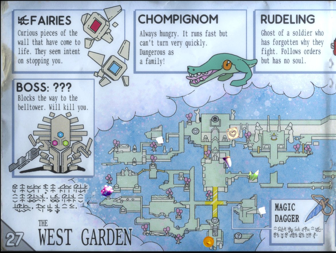 La saga Souls era parca en palabras y, sobre todo, eliminar el mapa de la pantalla obligaba al jugador a prestar atención al entorno que lo rodeaba para guiarse, lo que potenciaba la exploración. Tunic va más allá. Igual que Hyper Light Drifter, el juego de Shouldice no es que sea parco en palabras sino que casi todas las palabras están en un idioma desconocido para el jugador. No hay un mapa, hay un manual de instrucciones cuyas instrucciones están casi en su totalidad en un idioma casi 5 indescifrable, y esto se aplica a prácticamente todos los elementos del título, no sólo a la exploración del mapa.