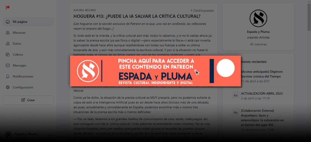 Sí, todo está en la mierda, y la crítica cultural aún más, todos lo sabemos, y si no lo sabías ahora ya lo sabes: la prensa escrita (ya sea física o digital —pero especialmente la física—) está casi muerta, agonizante desde hace años aunque resistiéndose con todas sus fuerzas a soltar su última bocanada de aire, y aún más concretamente la escritura cultural. Y por si la situación no fuese lo bastante mala, el campo de las letras parece ser uno de los primeros objetivos —junto a la traducción y la ilustración— de las IAs, o más bien de los esfuerzos del capitalismo, por eliminar factores humanos de la ecuación con los que intentar aumentar aún más sus beneficios a costa de ahorrarse unas cuantas nóminas. […]