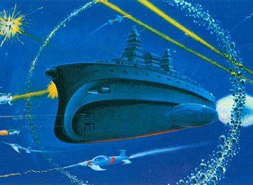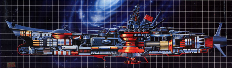 De izquierda a derecha, bocetos conceptuales de las distintas fases del proyecto que acabó convirtiéndose en Space Battleship Yamato. Como puede verse, los dibujos originales, Space Battleship Cosmo y Asteroid 6, no contaban en absoluto con el componente militar.
