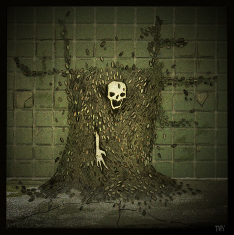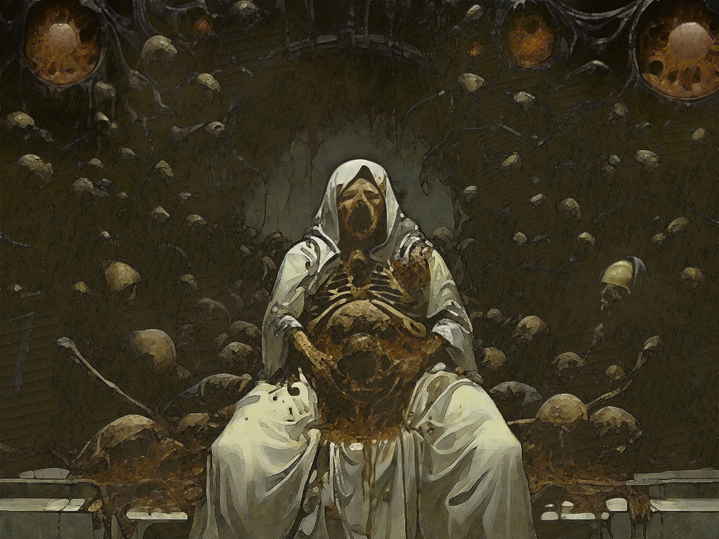 Hasta entonces, el Gran Padre las había utilizado para golpear carne, pero su piel, lejos del hierro de su hermano, era tan fina y frágil como un horizonte. Las manos se deshilacharon rápidamente, y de los dedos crecieron patas negras que se irguieron y corrieron a la boca de su dueño. Del hueco de su brazo nacieron flores rojas, y de ellas supuró una baba negra. Padre lloraba sangre y de sus gritos asomaban las arañas de su boca.