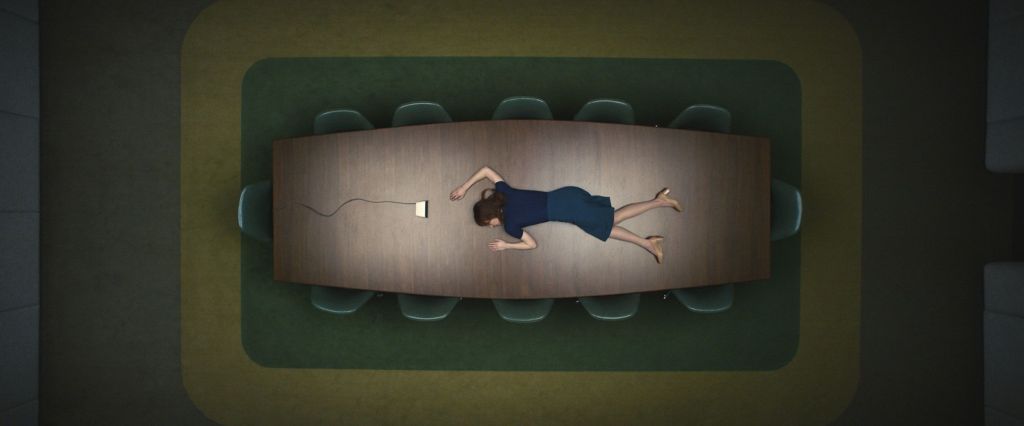 Refinamiento de Macrodatos es una amplia sala con luces blancas y techos bajos que “aplasta” a los personajes. Grabada con lentes anamórficas, la relación de aspecto de la imagen se expande de forma que las figuras y sujetos se separan y los bordes del frame se difuminan creando una sensación casi de ensoñación o surrealismo, un espacio que está alejado de la realidad. Estas lentes se utilizan también en muchas ocasiones para transmitir una impresión de nostalgia y melancolía, igual que los tonos de verde desaturado y artificial con los que está decorada la oficina.