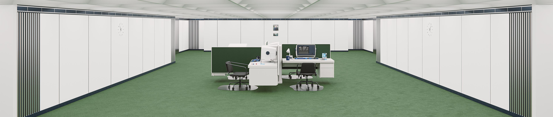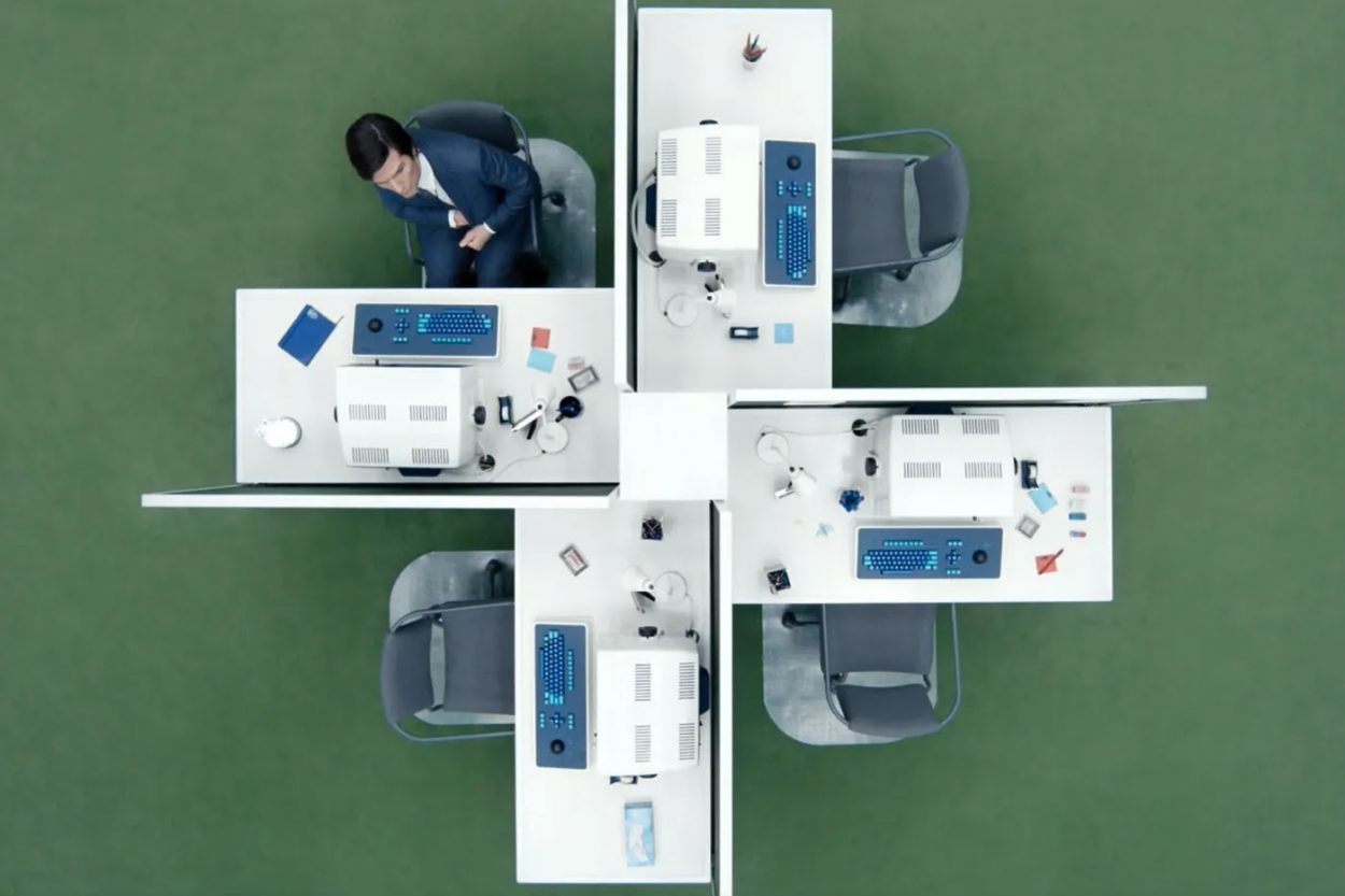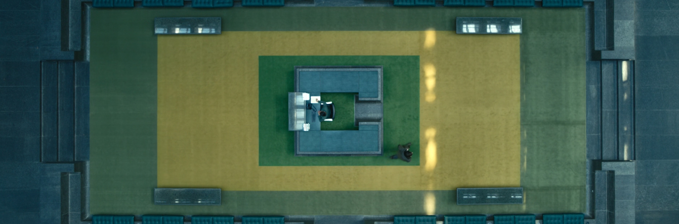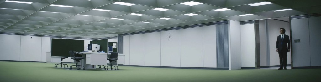 El puesto de trabajo de los empleados son cuatro escritorios en el centro de la habitación y unidos por un pilar central con paneles que suben y bajan permitiendo que se miren o no unos a otros casi como si la empresa buscase que se vigilasen entre ellos al desempeñar el trabajo. La concentración de sujetos y elementos en dicho punto convierte la sala de MDR en un espacio vasto y claustrofóbico simultáneamente, empequeñeciéndolos aún más por la cantidad de “vacío” que queda a su alrededor.